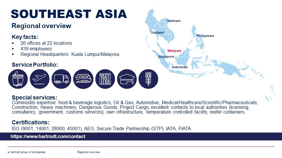 Hubs in the region play an important role for goods from Europe. Kuala Lumpur Airport serves as an airfreight hub for Australia, while the port of Singapore operates as an LCL hub for the region and Oceania. Kristian Sabitzki emphasizes a. hartrodt's in-house customs clearance: "In Indonesia or the Philippines, this is not a matter of course." Another special feature he mentions is the industry focus on oil & gas in Malaysia, Singapore and Indonesia. He sees the greatest growth opportunities in the ongoing relocation of production capacities: "We actively support customers in their location selection and with customized logistics solutions."